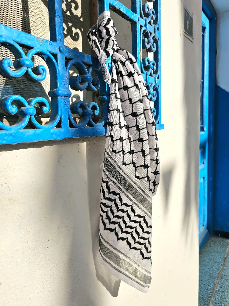 The bold lines reflect Palestine’s rich history of trade and cultural exchange, the olive leaves symbolize resilience and perseverance, and the fishnet pattern connects Palestinian fishermen to the Mediterranean Sea.