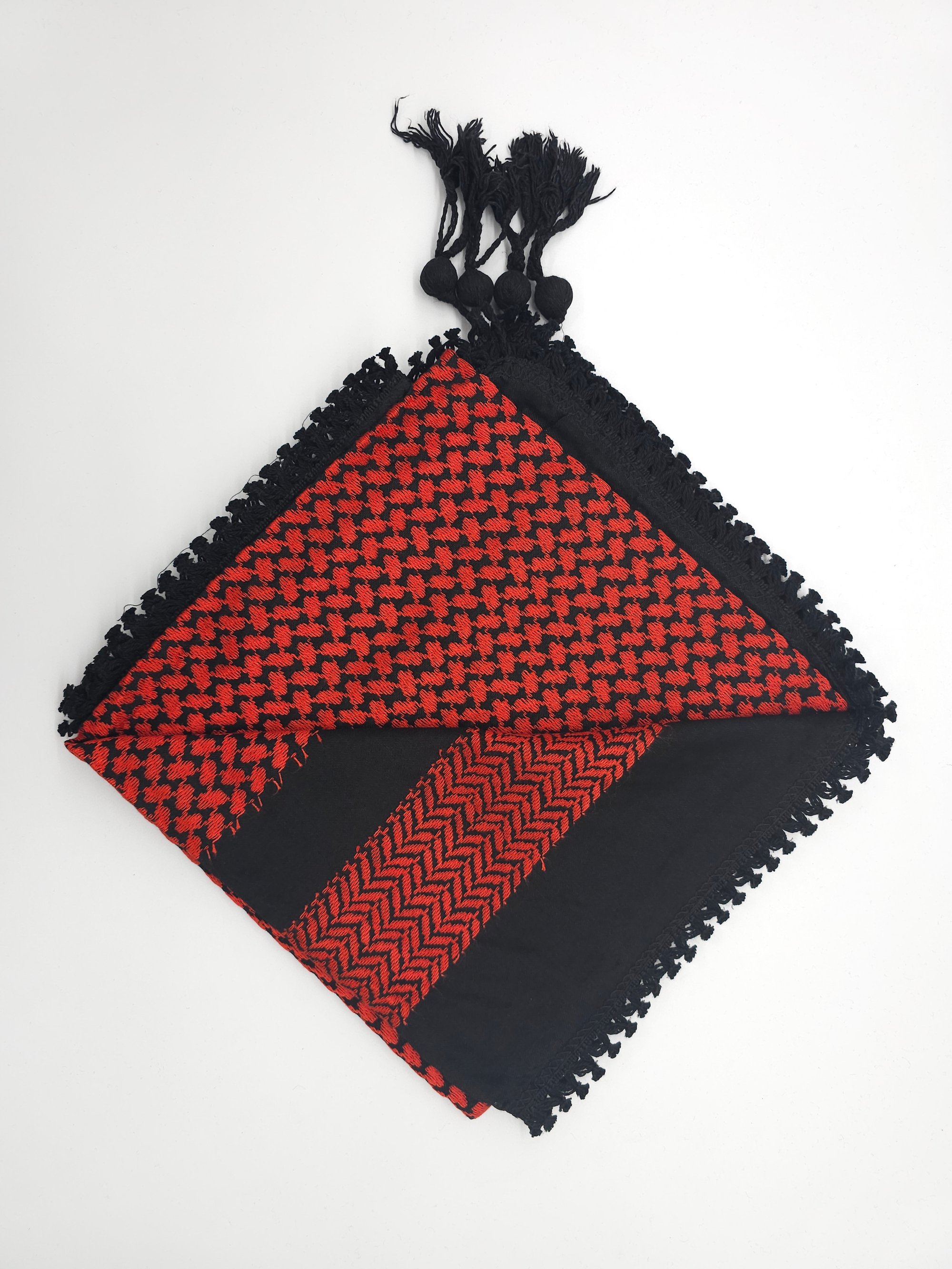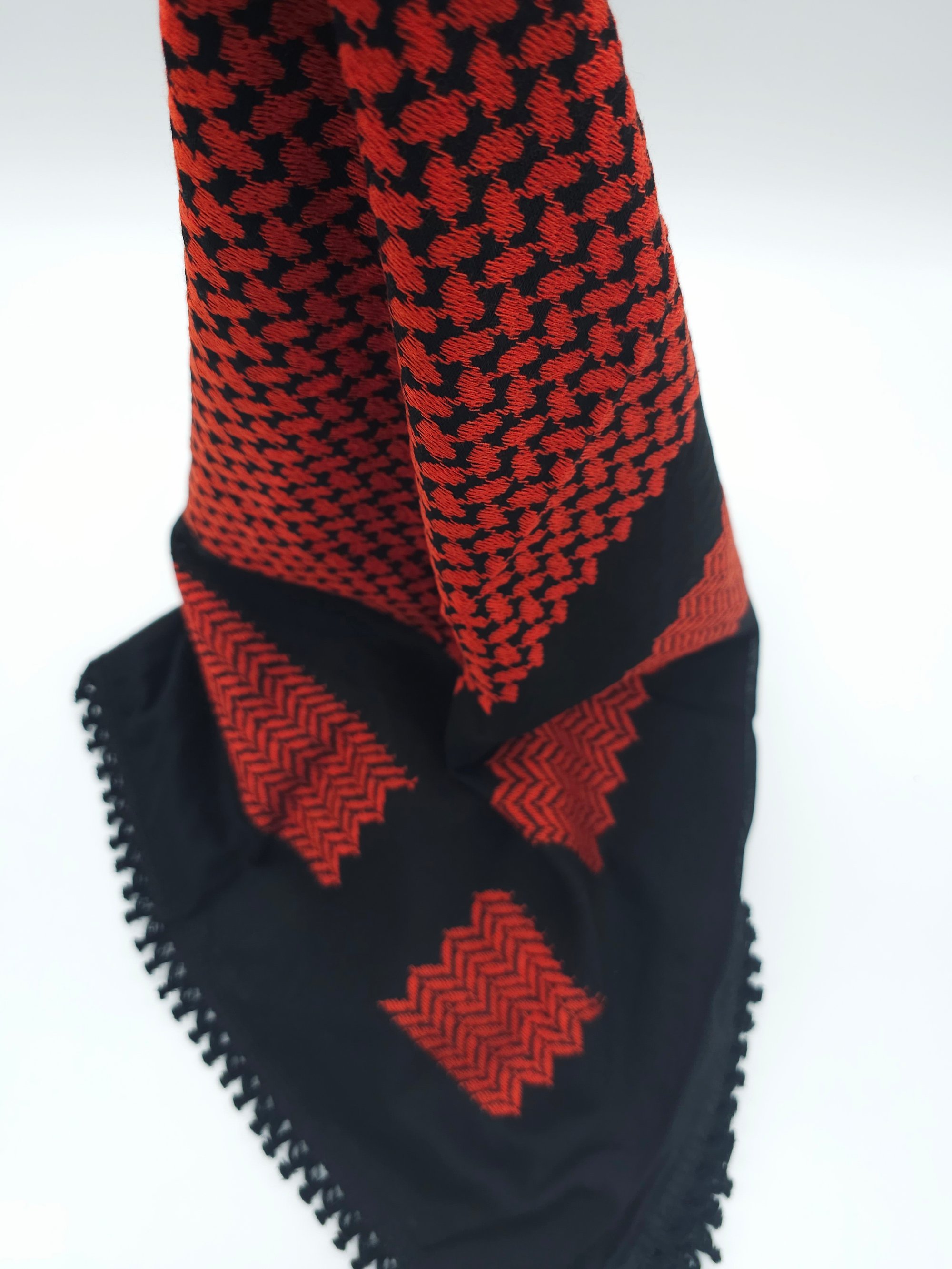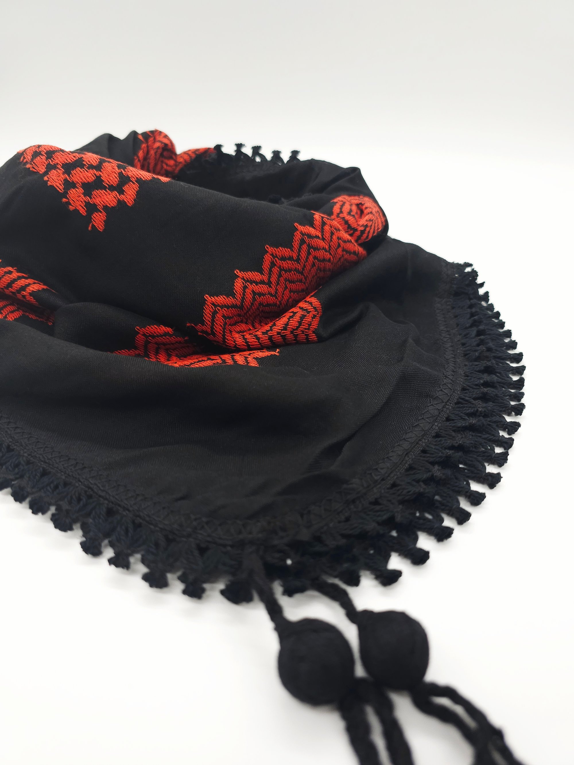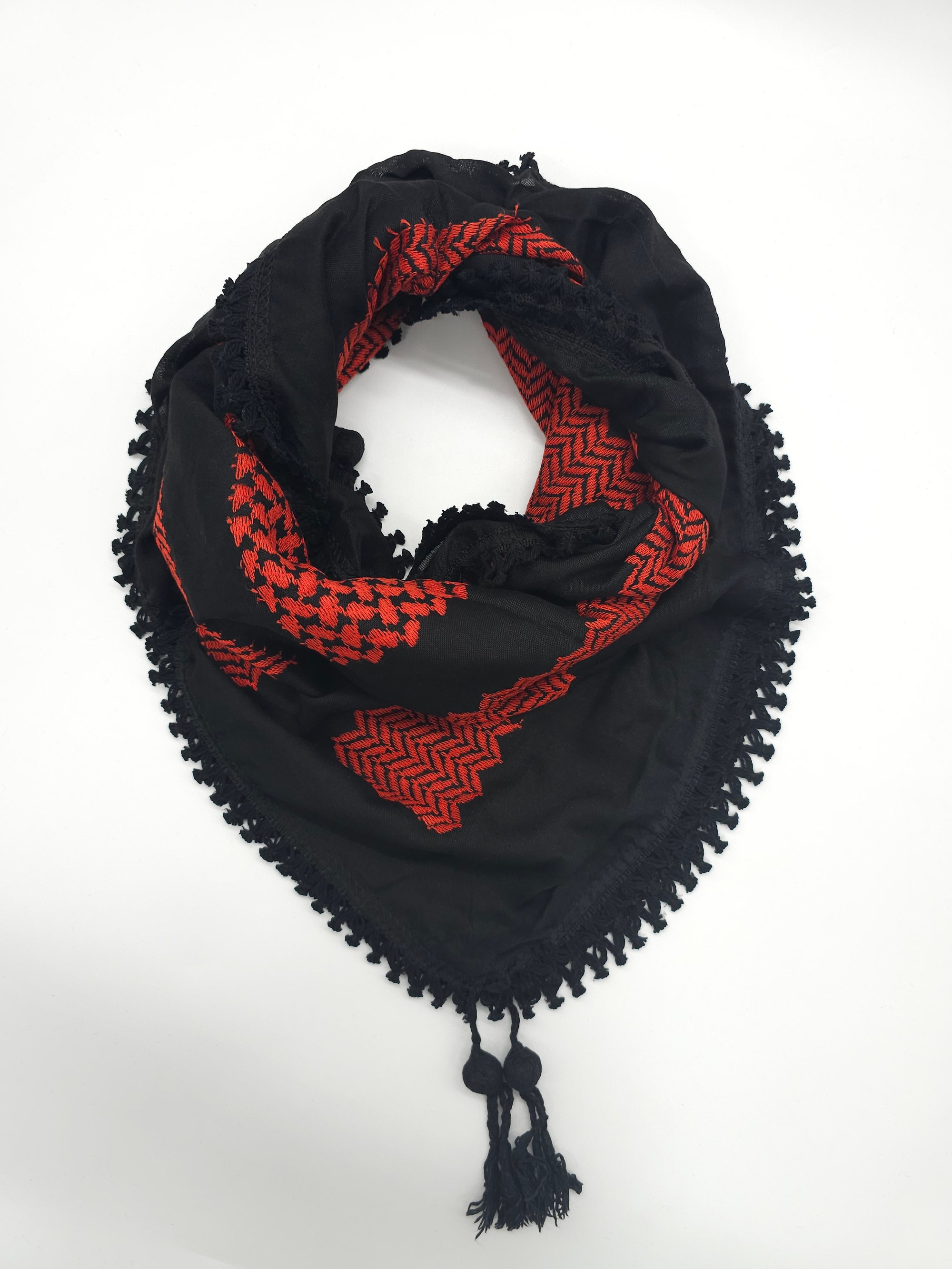 Wrap yourself up in these beautifully made, high quality Palestinian Keffiyeh. Made in Jordan, these quality Keffiyeh have vibrant shade of embroidery against a black background.