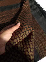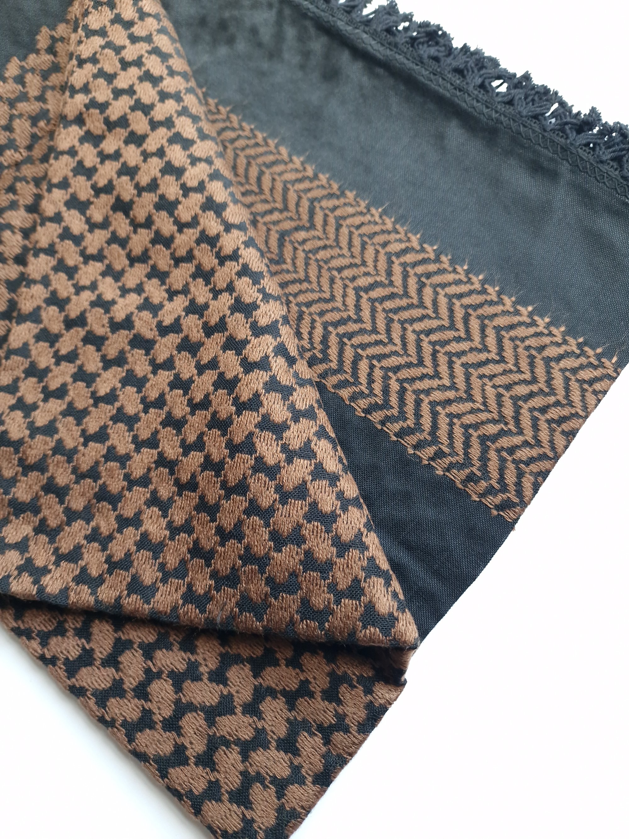 Wrap yourself up in these beautifully made, high quality Palestinian Keffiyeh. Made in Jordan, these stunning Keffiyeh have beautiful shade of brown embroidery against a black background. They are soft to touch and easy to style. A culturally significant emblem, Keffiyehs have become popular around the world as a symbol of solidarity with the Palestinian people and support for the call for peace in the region.