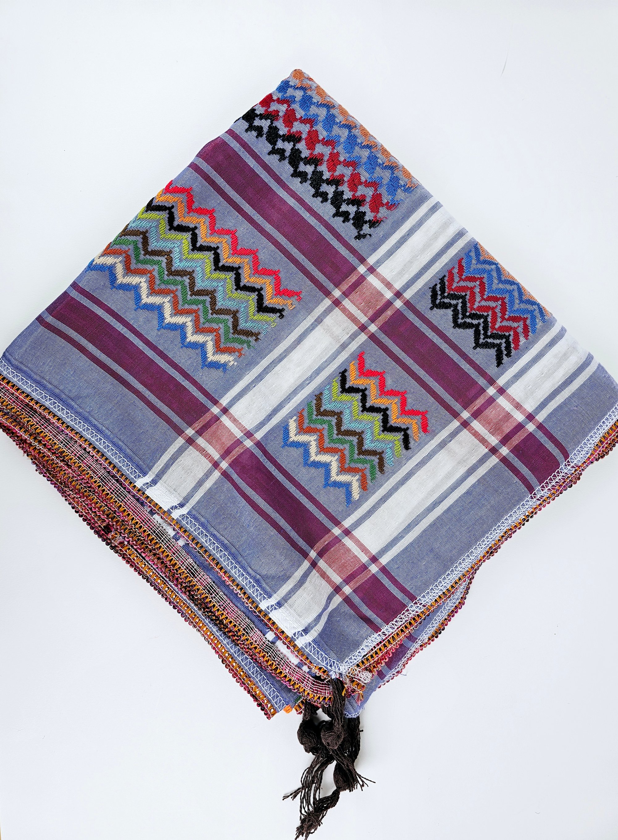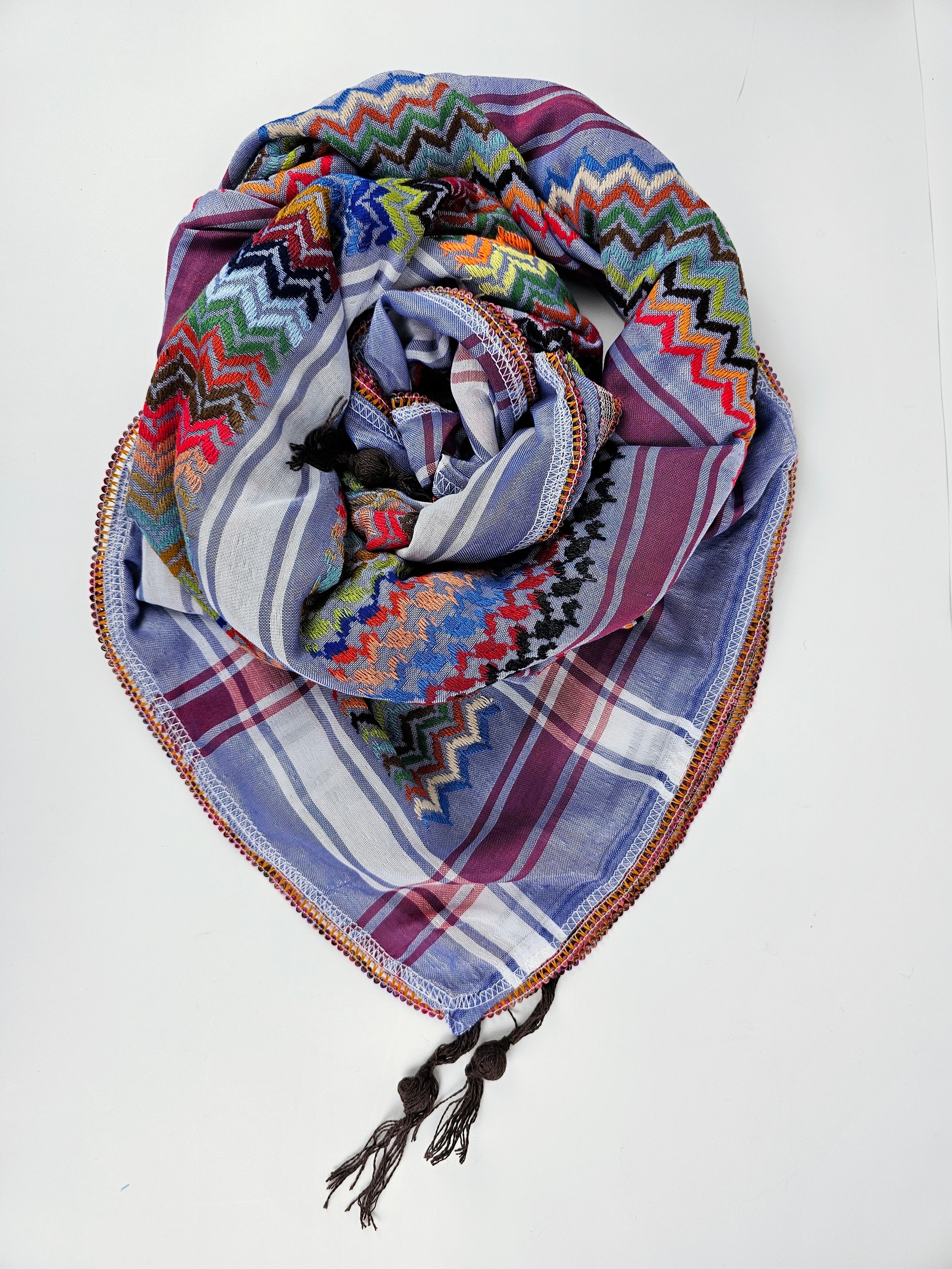 Wrap yourself up in these very unique and beautifully made, high quality Jordanian Keffiyeh in solidarity with the people of Palestine. Made with high quality materials, these Keffiyeh, embroidered in stunning colour against a refreshing background. A culturally significant emblem, Keffiyehs have become popular around the world as a symbol of solidarity with the Palestinian people and support for the call for peace in the region.