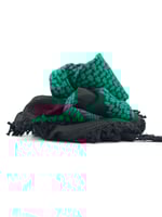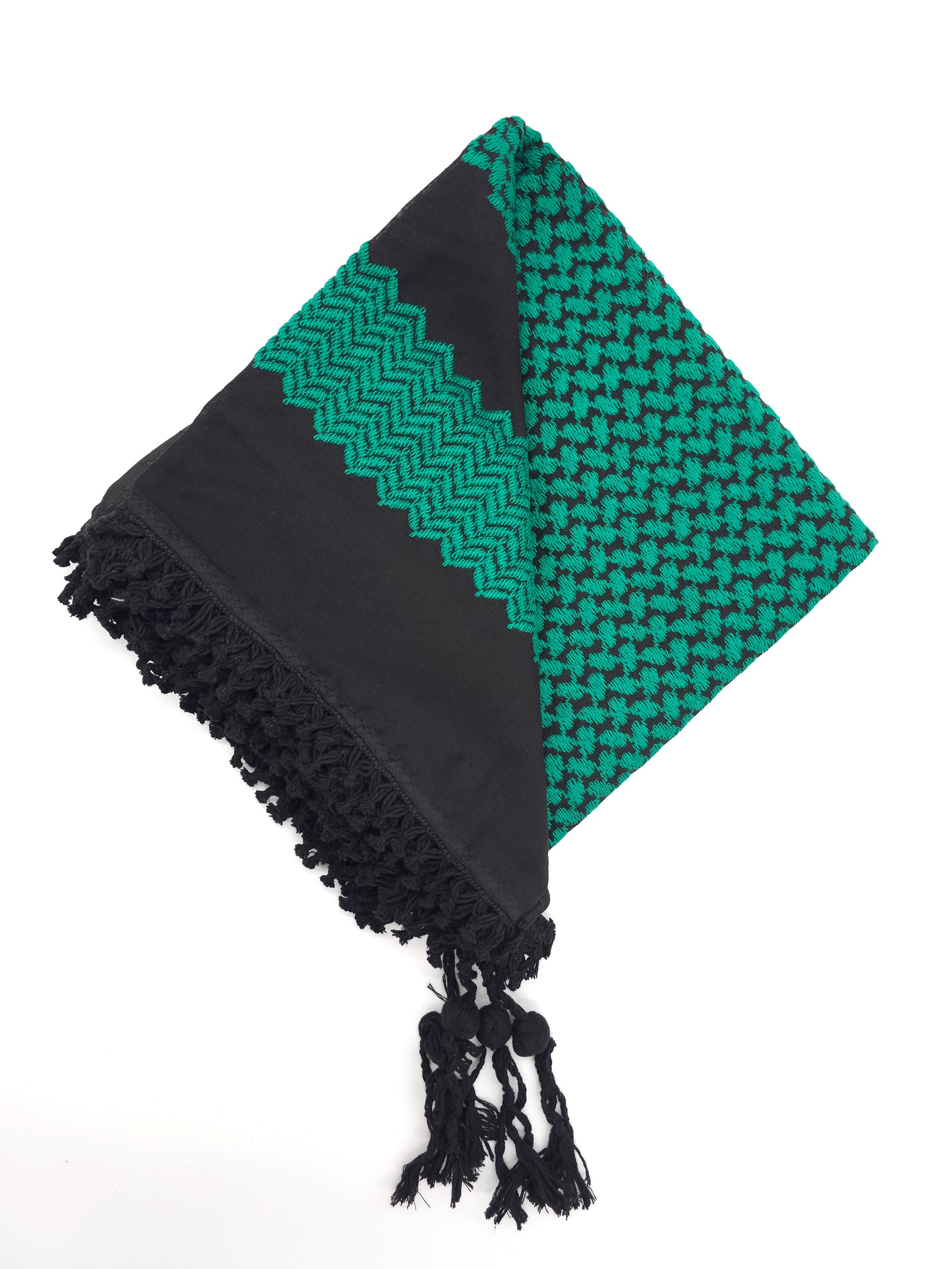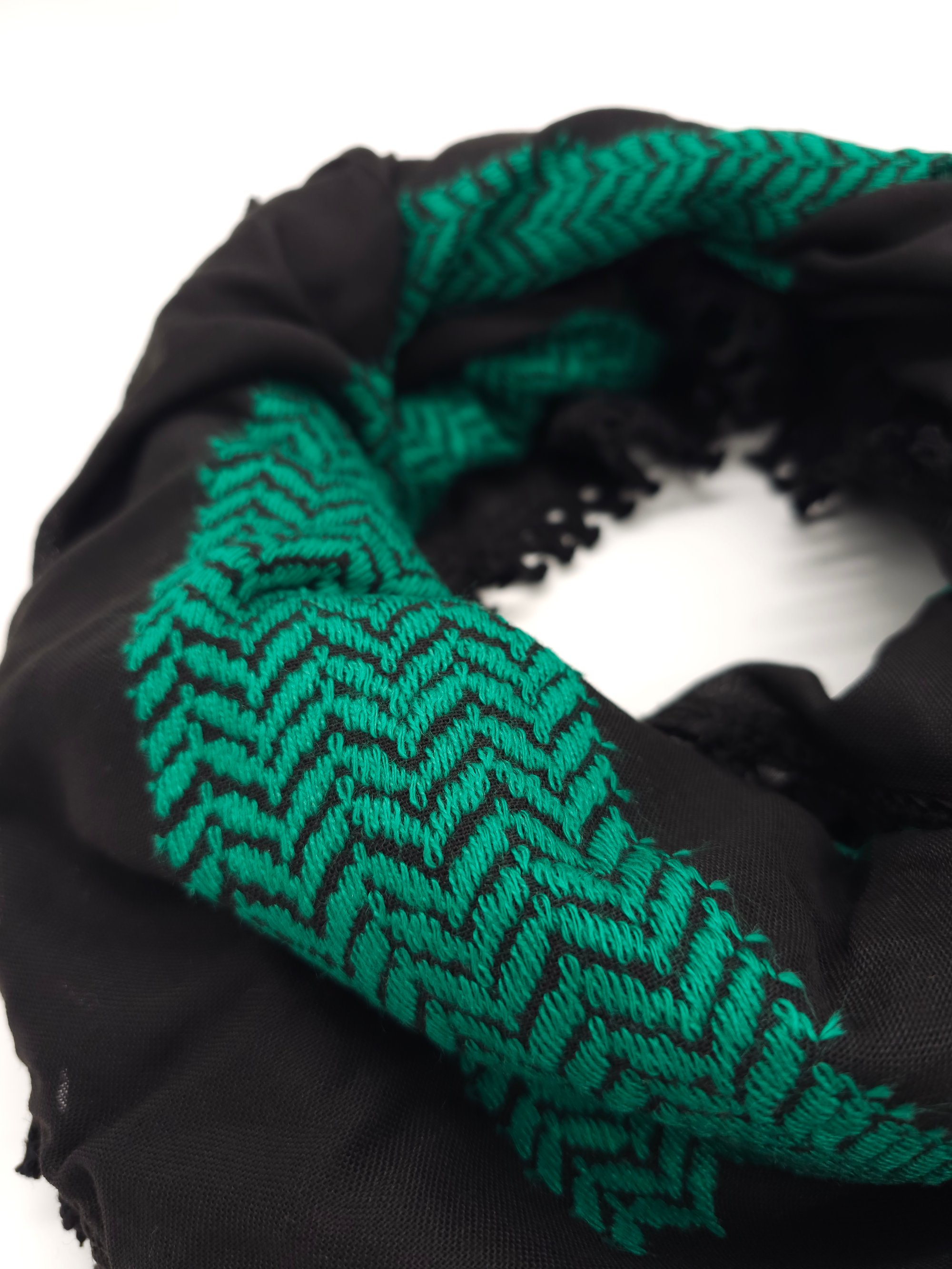 Wrap yourself up in these beautifully made, high quality Palestinian Keffiyeh. Made in Jordan, these stunning Keffiyeh have stunning emerald green embroidery against a black background.