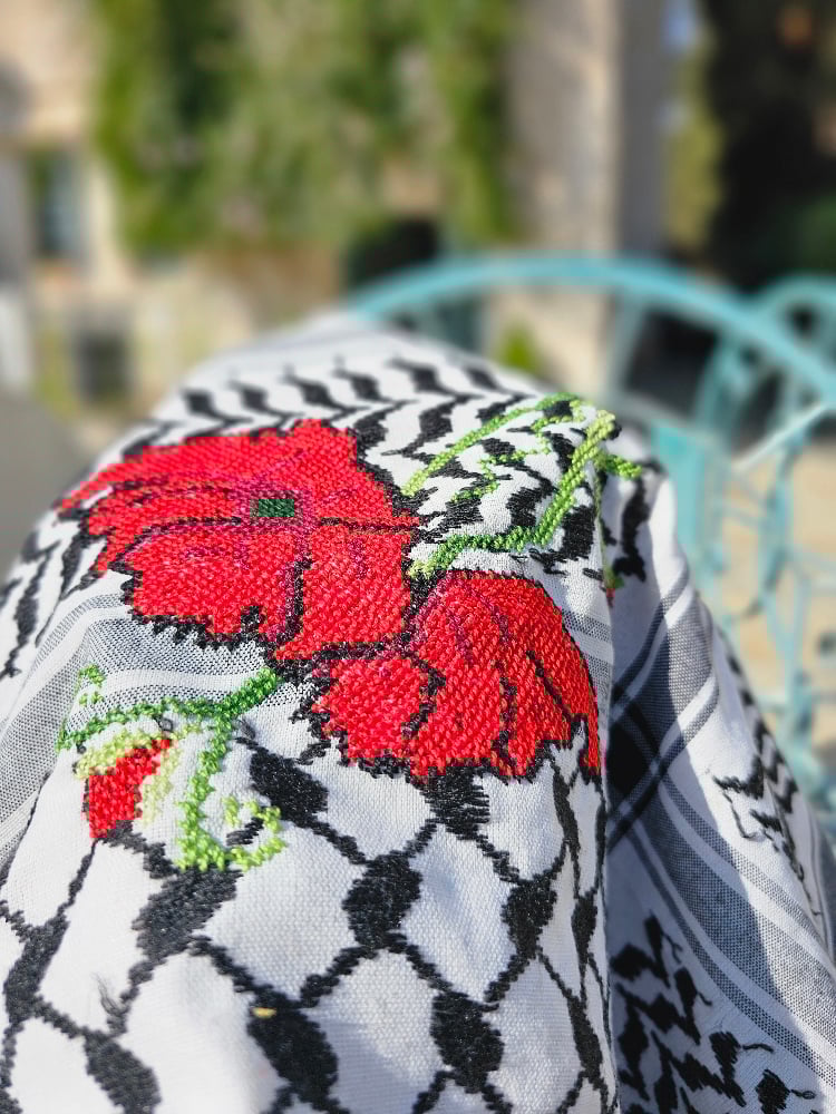 Bisan works with local women in Dalal, Beit Doqo, who hand embroider red poppies on to the Keffiyeh. The red poppy is Palestine's national flower, it is symbolic of their resilience, hope, sacrifice, and dignity.