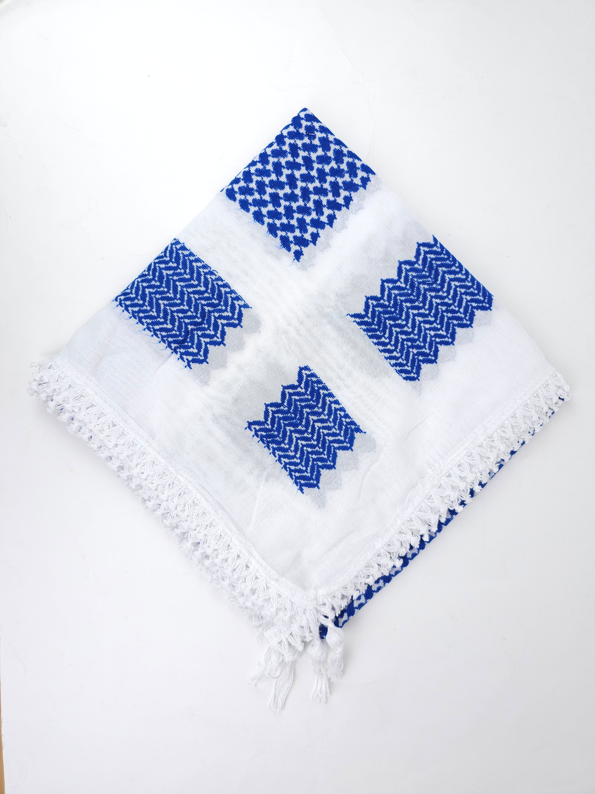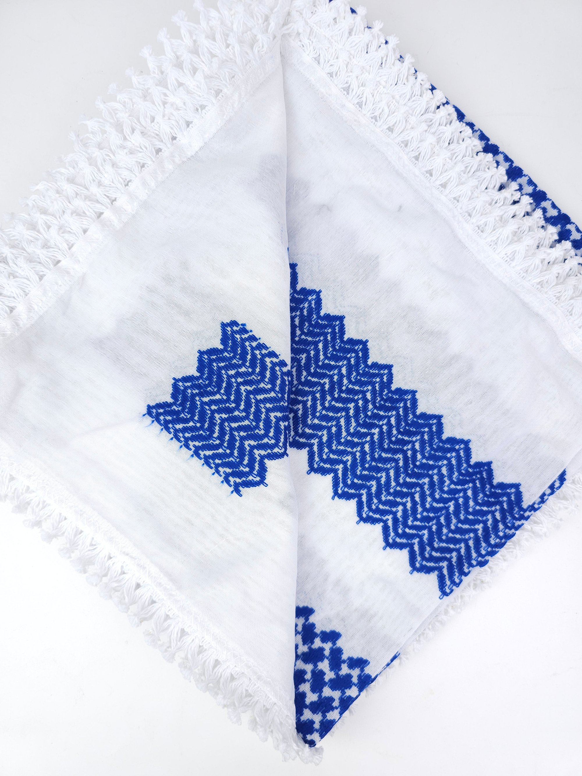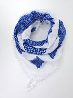 Made with high quality materials, these Keffiyeh, embroidered in stunning royal blue colour against a crisp white background.