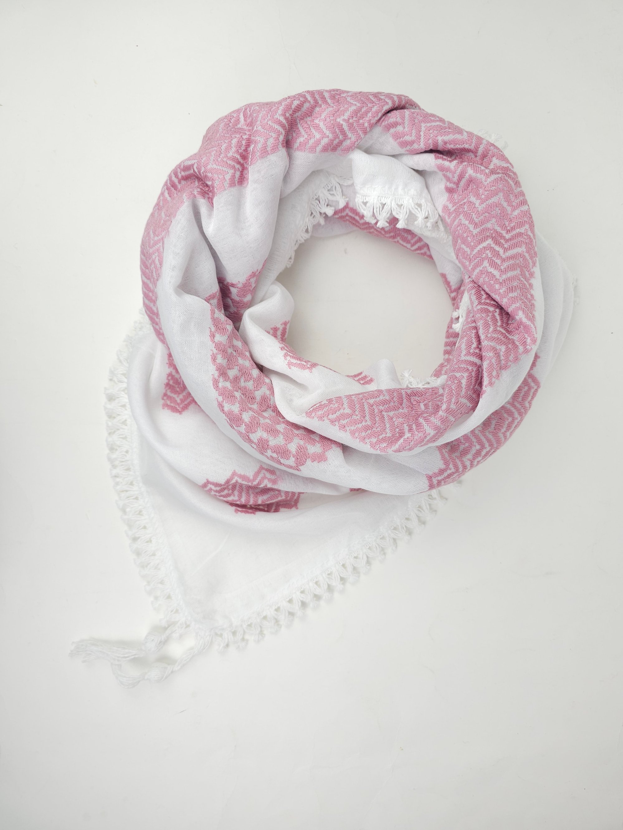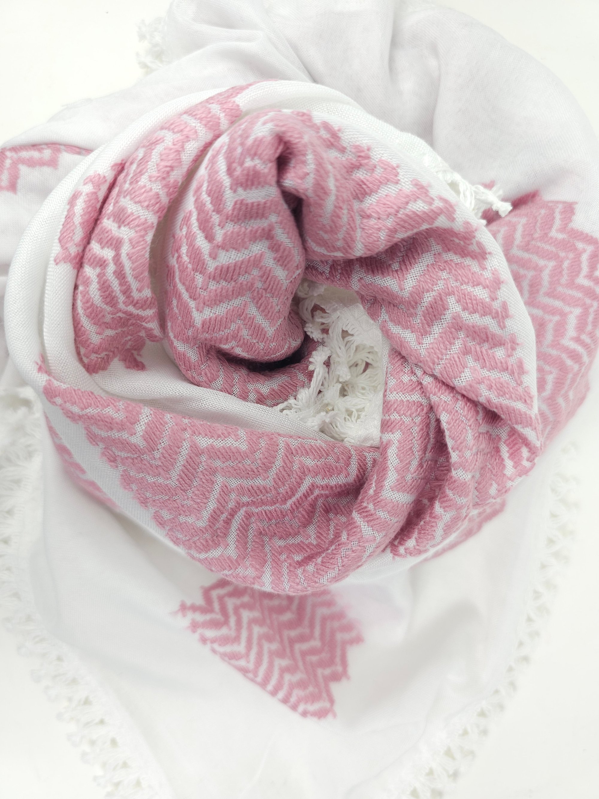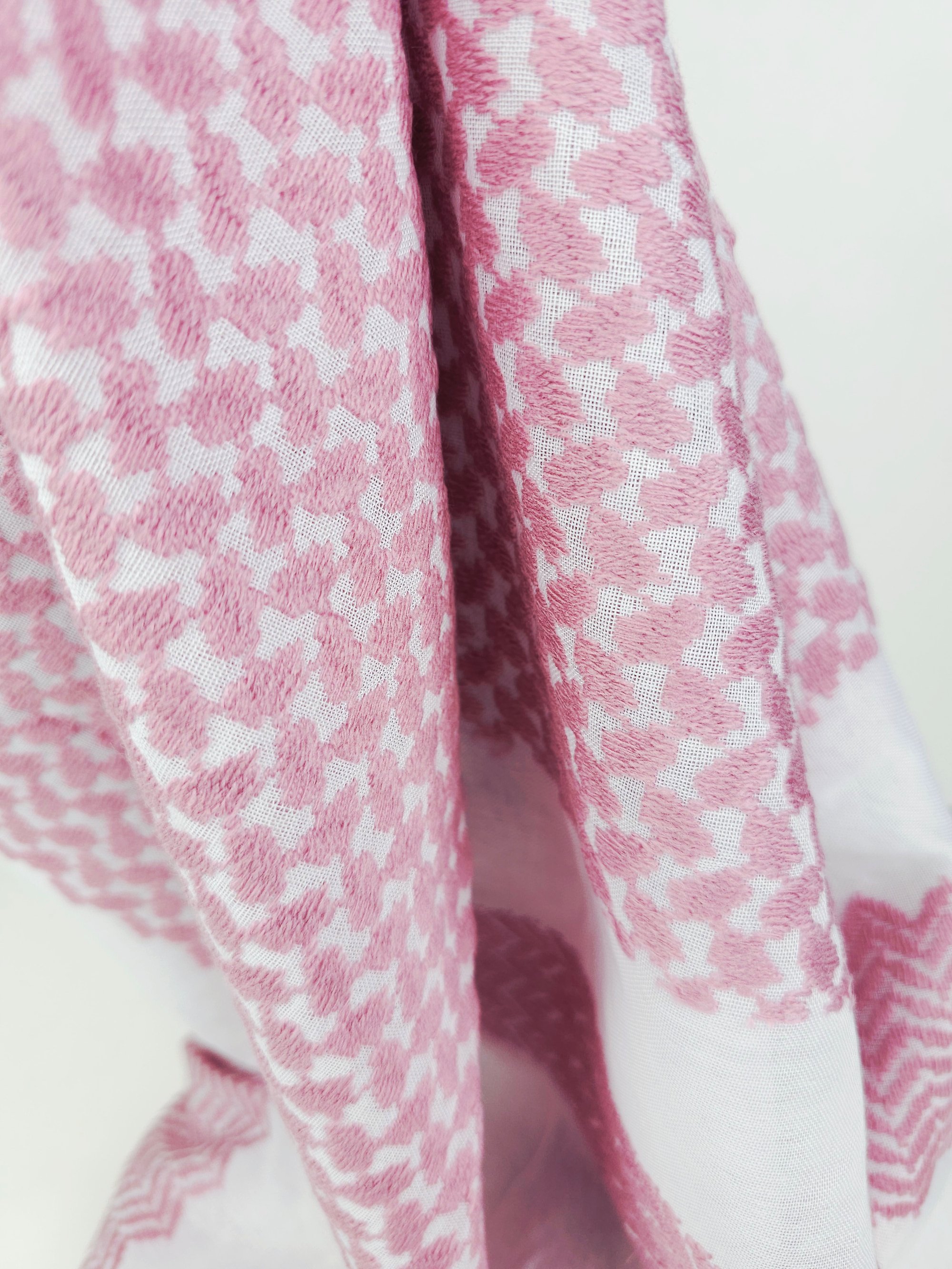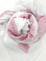 Made with high quality materials, these Keffiyeh, embroidered with delictae pink thread, against a crisp white background. these feel super luxuriose in your hands and wrapped around you.