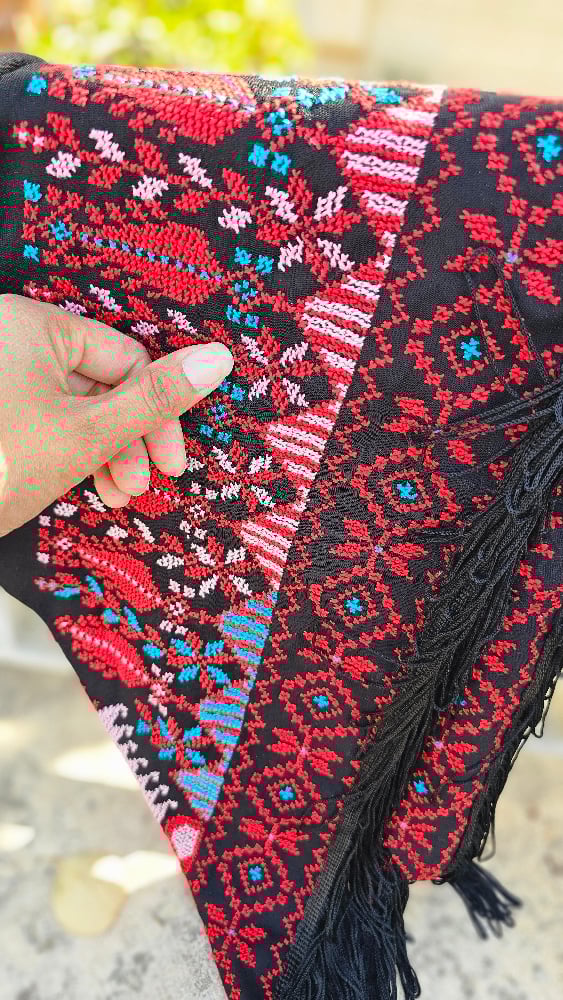 - Hand-embroidered by Um Rashid, a renowned Palestinian artisan in Jordan