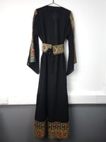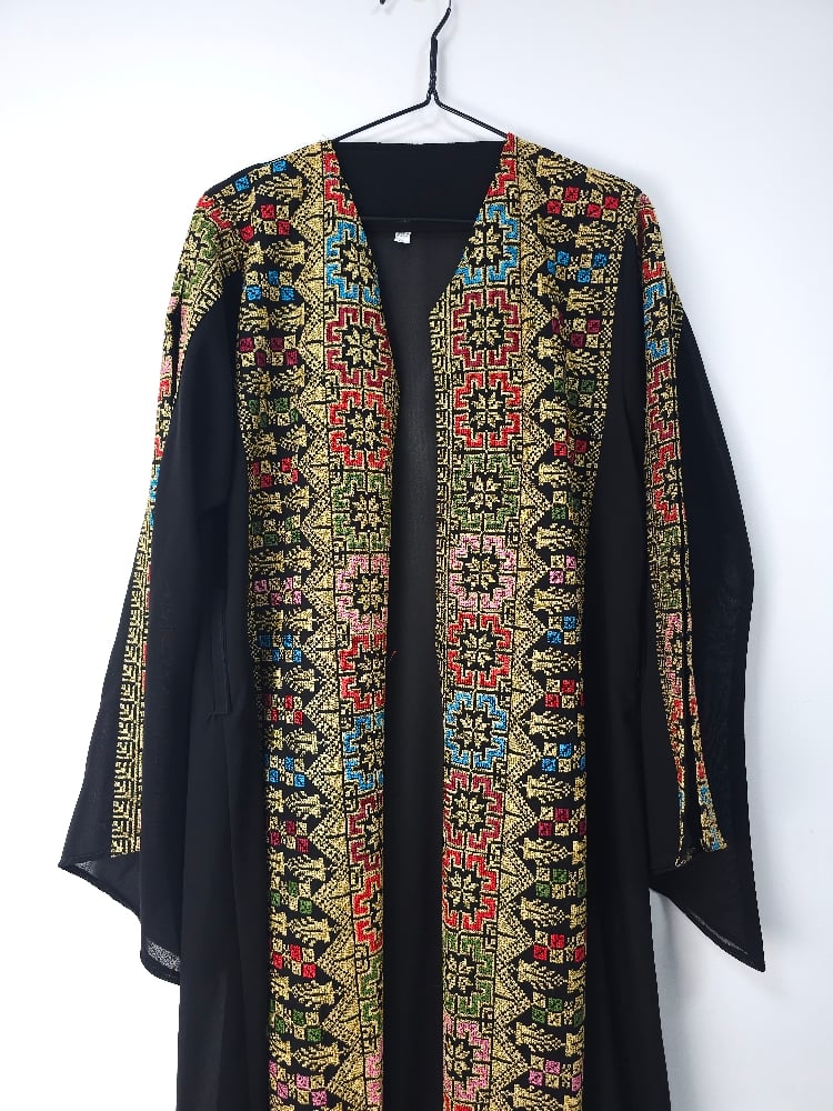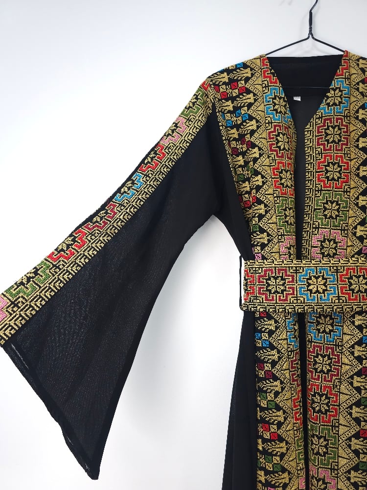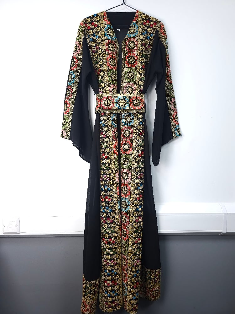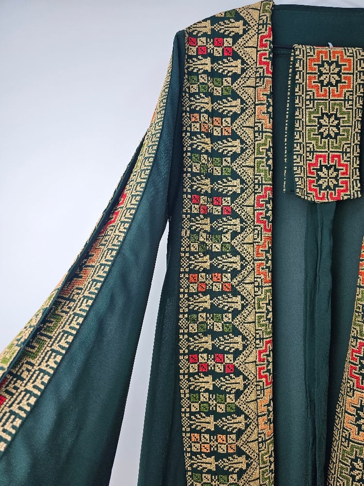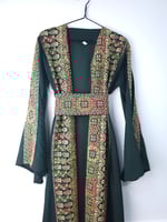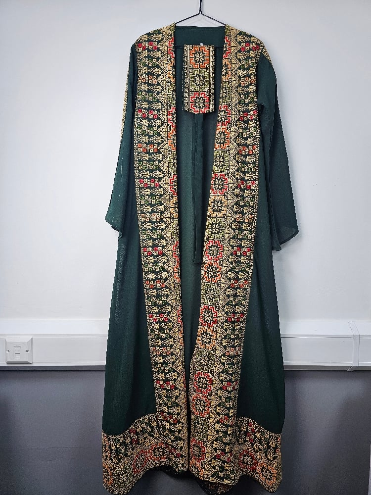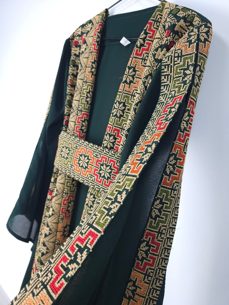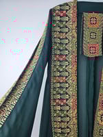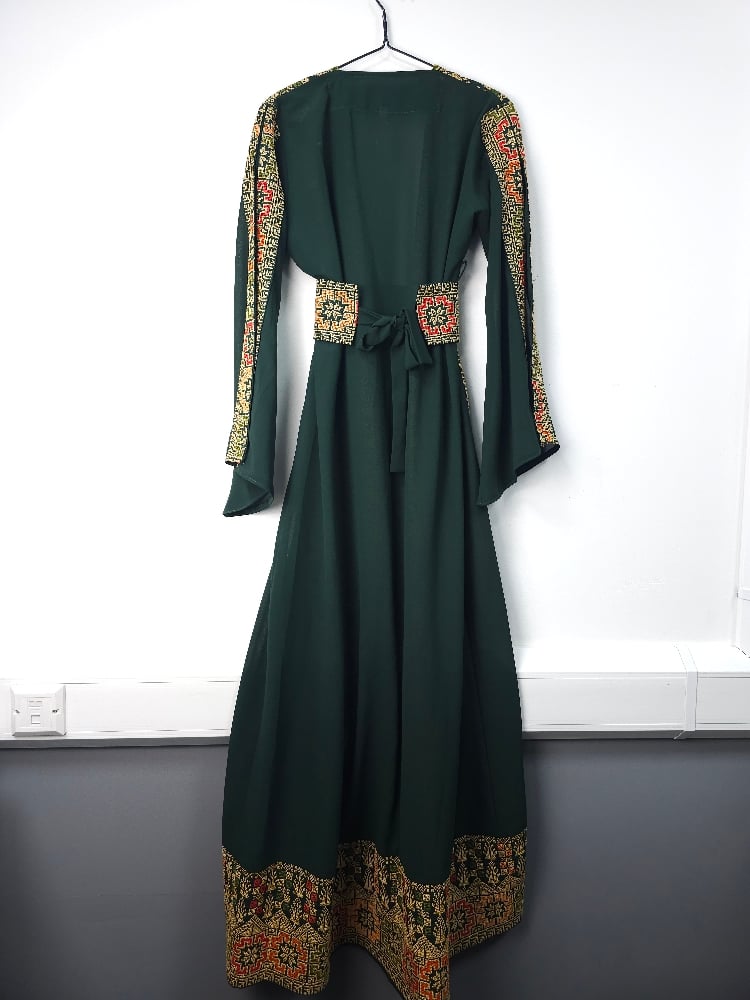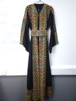This Jordanian made Palestinian Tatreeze inspired ladies gowns, it's a way to celebrate a culture that cannot be erased, a culture full of life and light, of faith, of humanity and determination. Beautiful embroidery on navy, green or black backgrounds, with split sleeves and a matching belt; this stunning gown is figure flattering and suitable for all shapes and sizes. It can be worn open or with the matching belt making it a versatile piece. Hand picked from Jordan, from us to you. Crafted from beautiful, light fabric, it provides the perfect combination of comfort and style. As always each purchase supports the people of Palestine. Because we know the people united will never be defeated. Unique, timeless and exclusive to Hubb and Huriya. Made in Jordan.