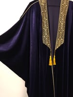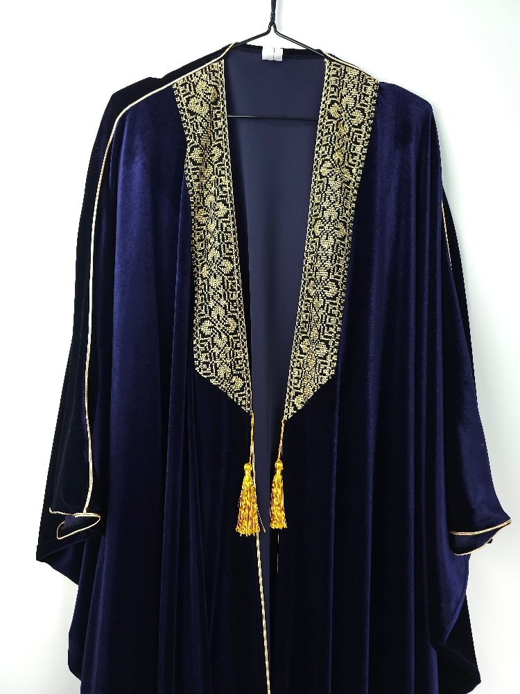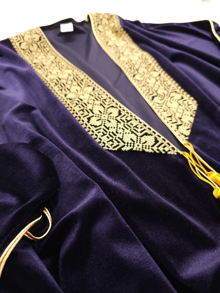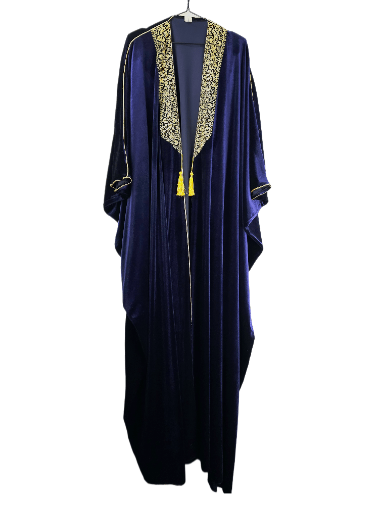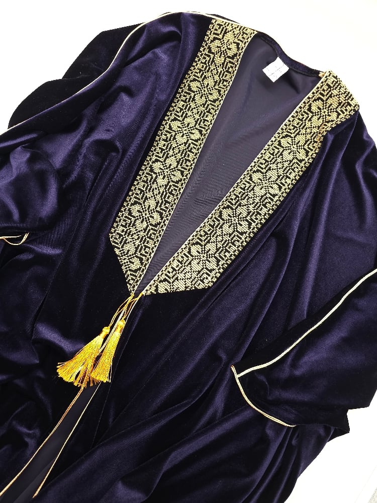 This luxurious Velvet Abaya, inspired by Palestinian Tatreeze on its border and in the style of a Arabian Abaya.